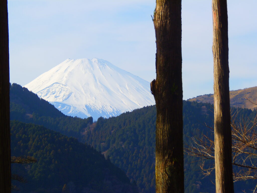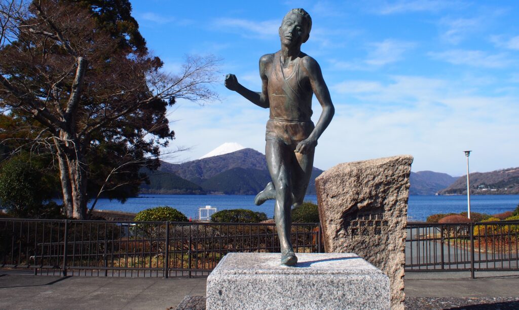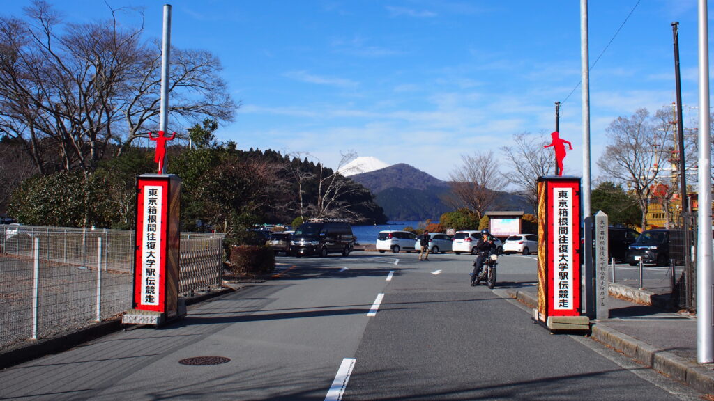 遠くに富士山を見つつ、芦ノ湖を捉える「往路ゴール」そして、翌朝には「復路スタート地点」となる。
