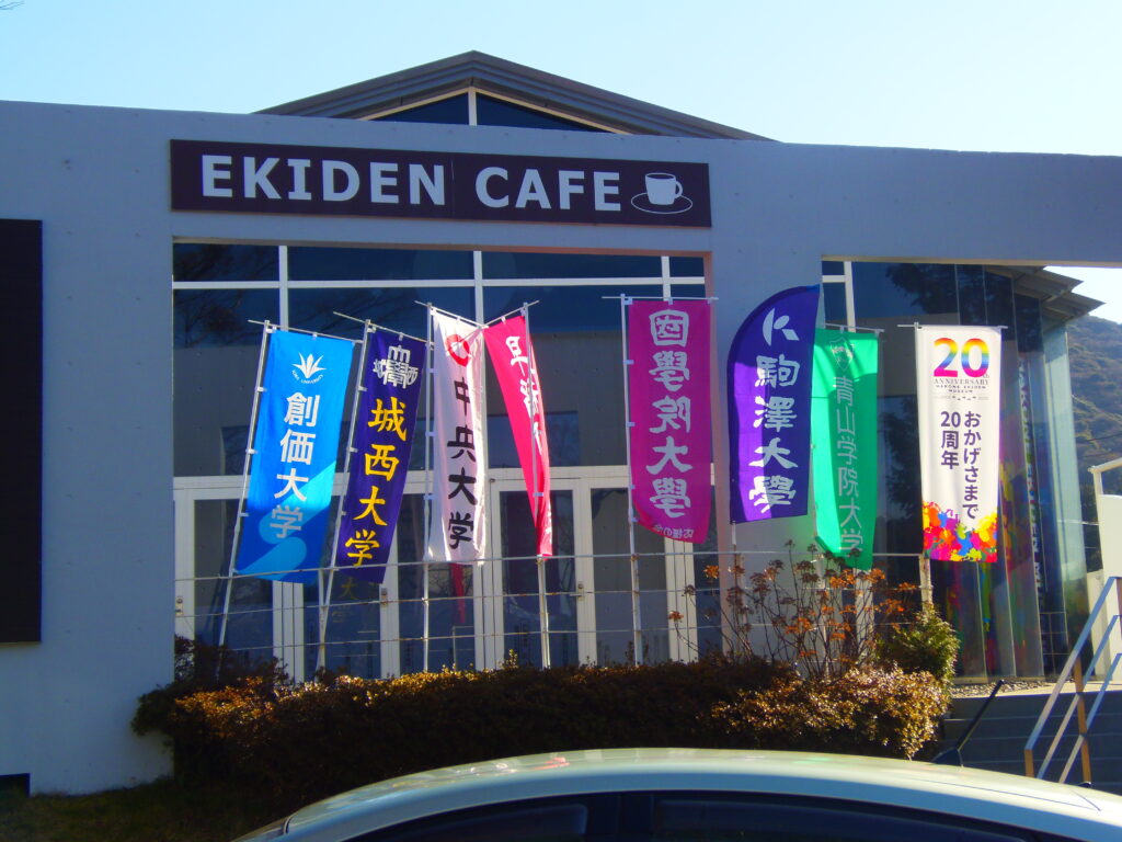 2026年102回の出場校ののぼりが出迎えてくれる。ミュージアムは有料だが、駅伝オリジナルグッズを販売するショップだけは無料で入れる。