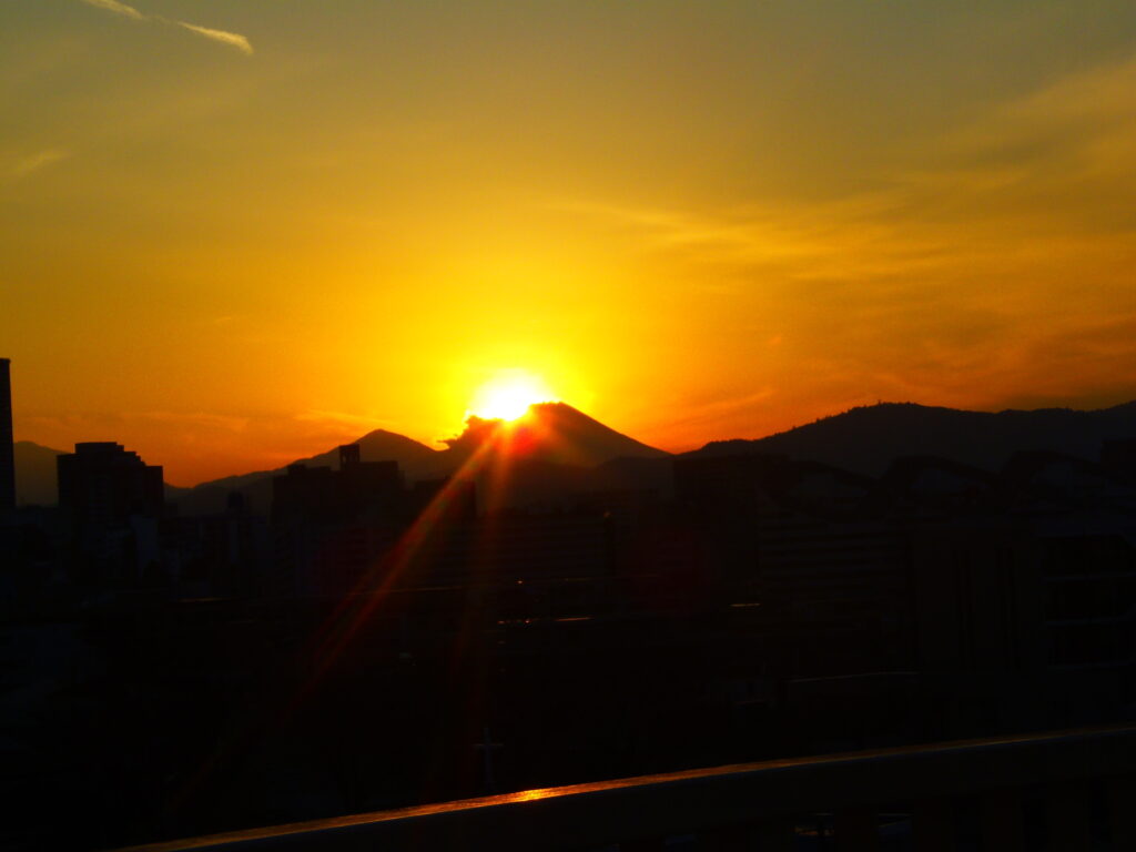 やっぱりというか、12月初旬であれば、シルエットの富士山の真ん中に太陽が沈む。今では左側にずれて沈む…という話を写真を撮りに来ていた方から聞いた。