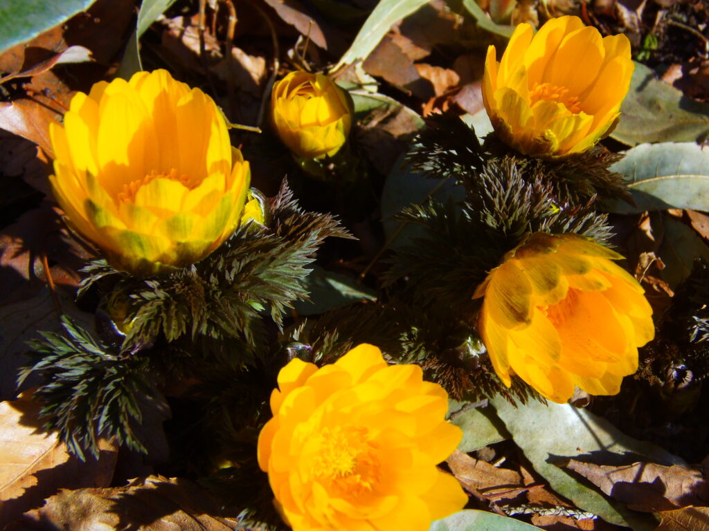 いつもの場所に、「福寿草」の黄色い花が点在しているのを見つけて小躍りするわたし。