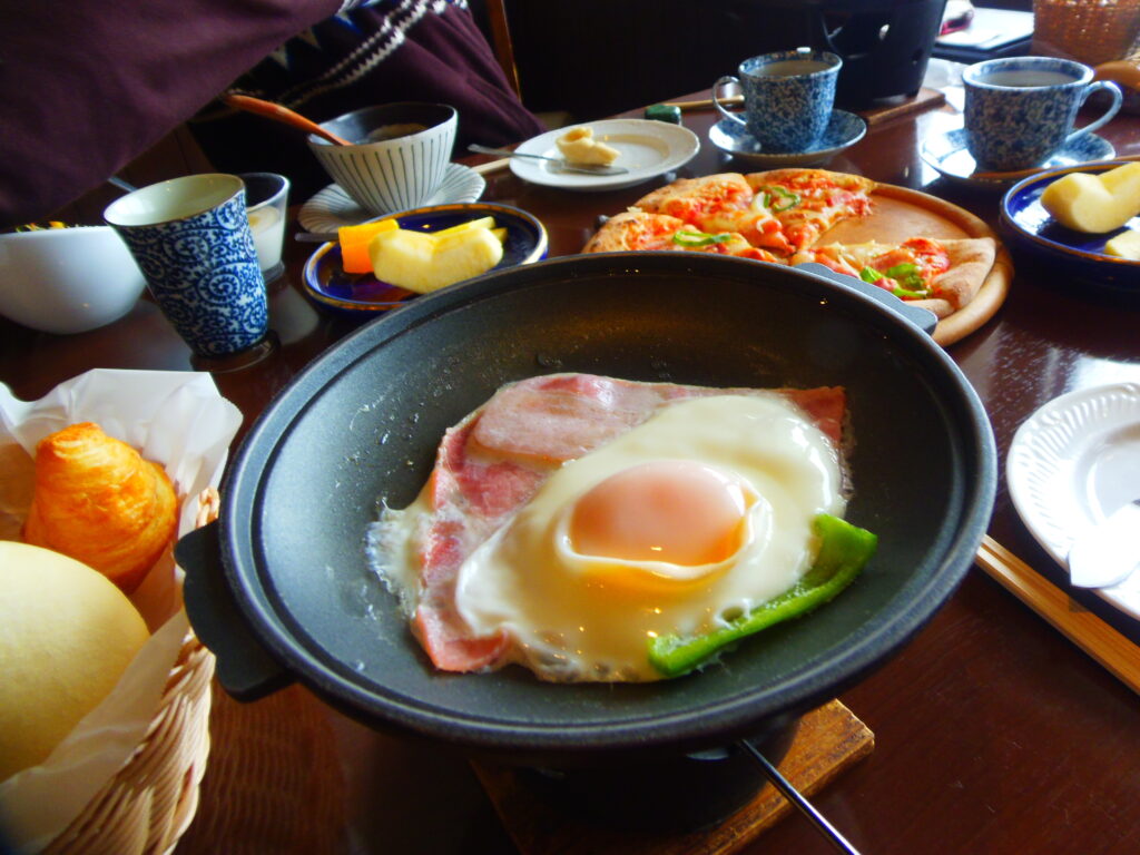 そして、朝食がこれまた素晴らしい洋風コースメニュー。焼きたてパンとピザはお土産にしてもらった。
