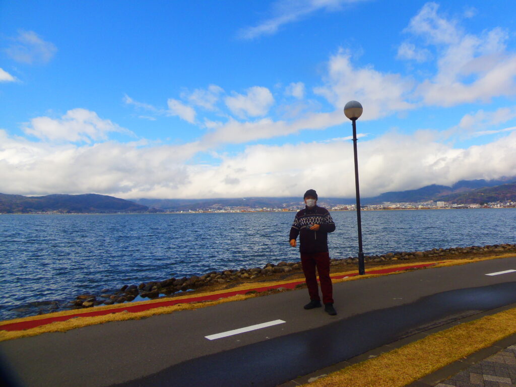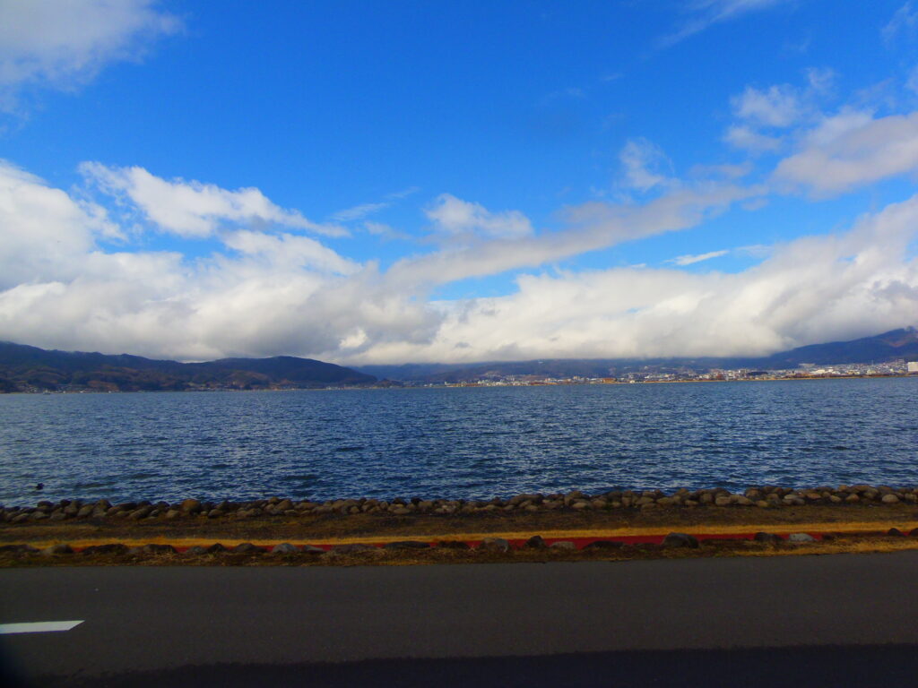 午前10時には、諏訪湖畔について、ちょっとコンビ二でひと休み。これまで長野県へ何度も出向いていたのに、諏訪市は完全に素通りだった。