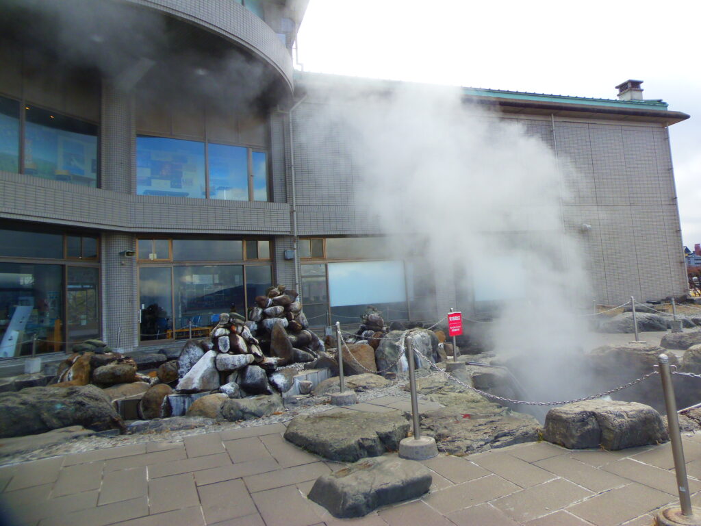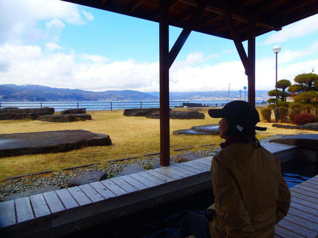 間欠泉センターには諏訪湖を眺めながら、湧き出る温泉の足湯(無料)があるので、さっそく入ってきた。