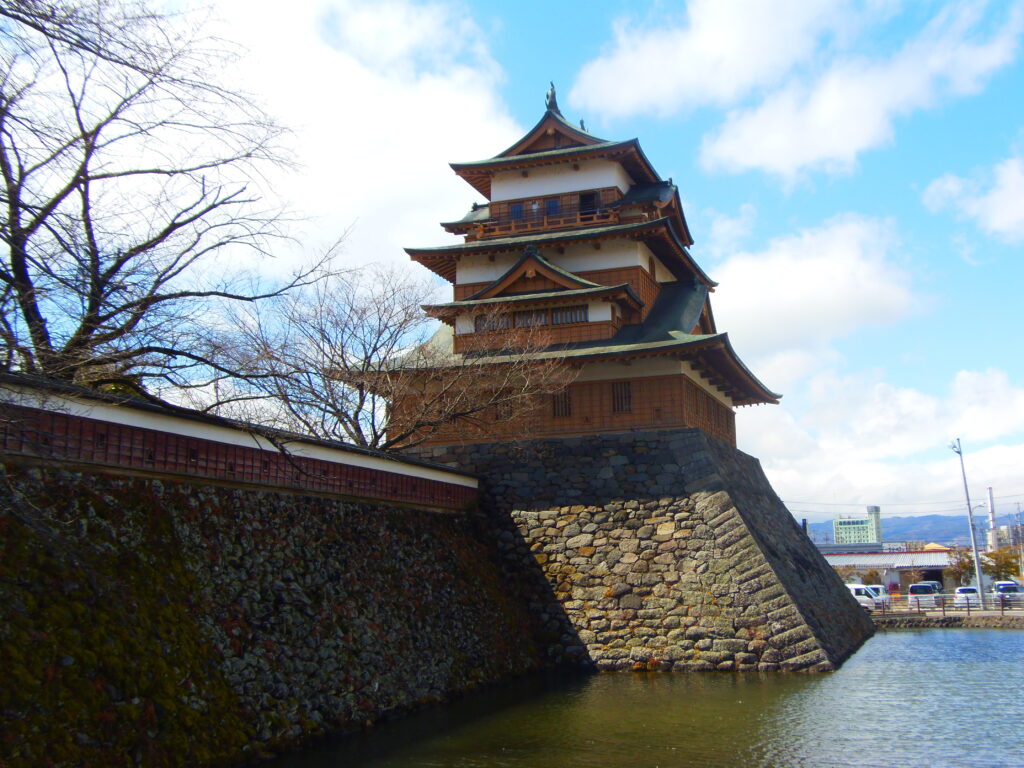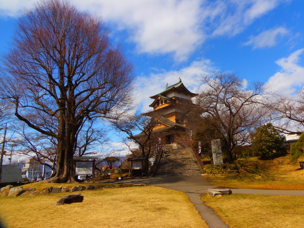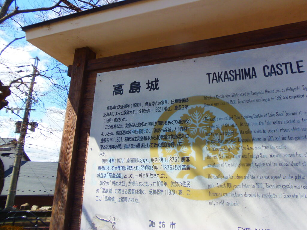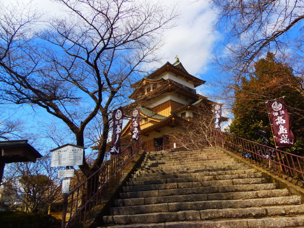 諏訪氏が藩主として治め、明治維新で破却されたが、昭和45年に天守が復興した。現在は「諏訪の浮城」として親しまれる名所である。