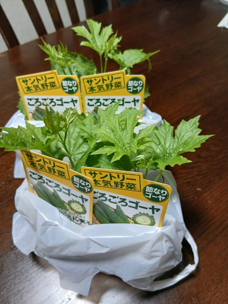 最後にはひとり2つのゴーヤ苗を頂いて終了。(今年頂いたゴーヤ苗はサントリーのもの。昨年はデルモンテだった。企業の栽培された苗は毎年研究開発されているのでとても育成しやすい!ということで講座に選ばれているらしい)