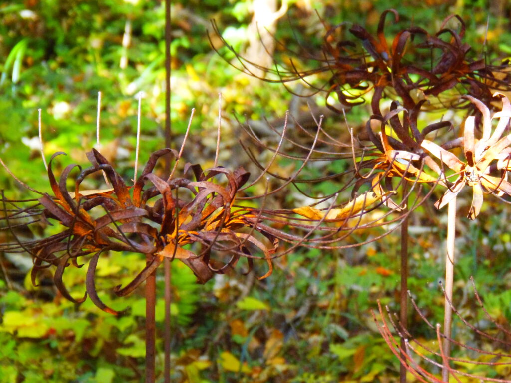 コーナーから森に目をやると、そこには、「えええっ~~~!!!めっちゃ枯れてる彼岸花がたくさん咲いてる!」と、しばし、茫然としてしまった。