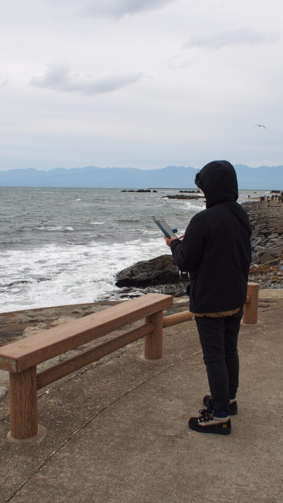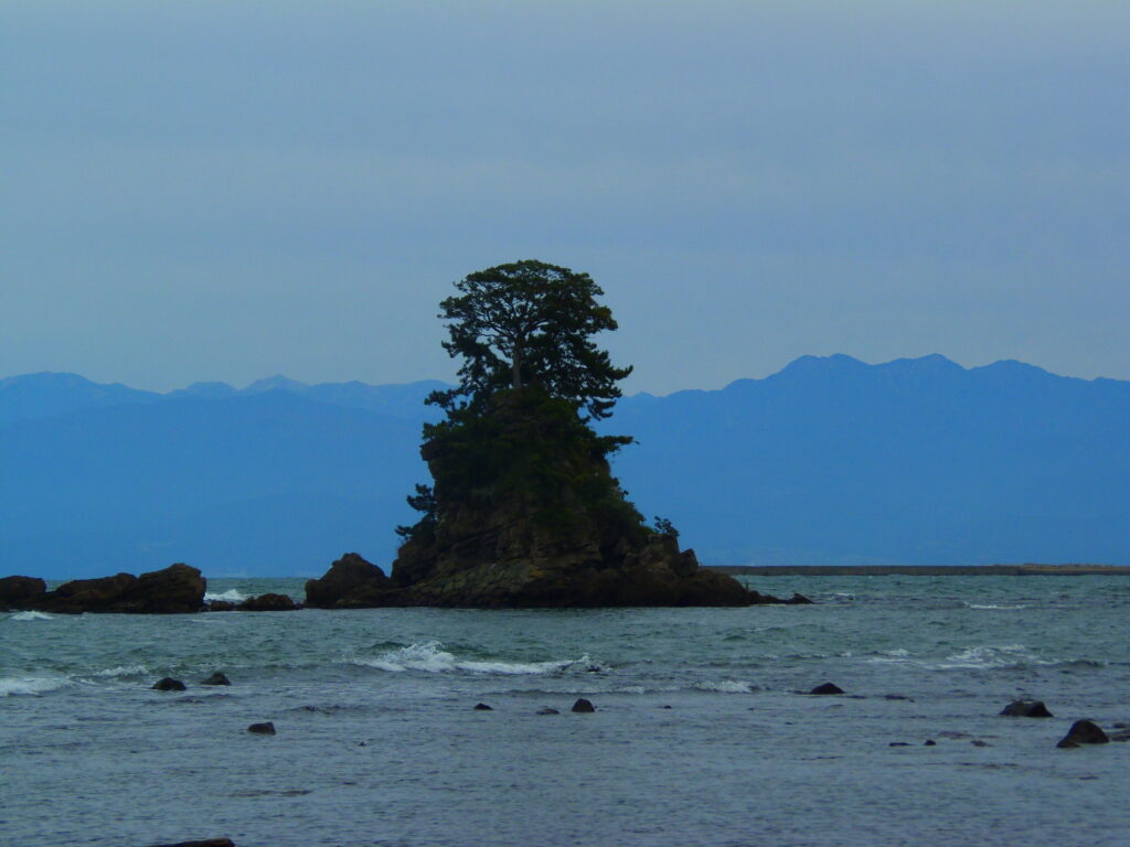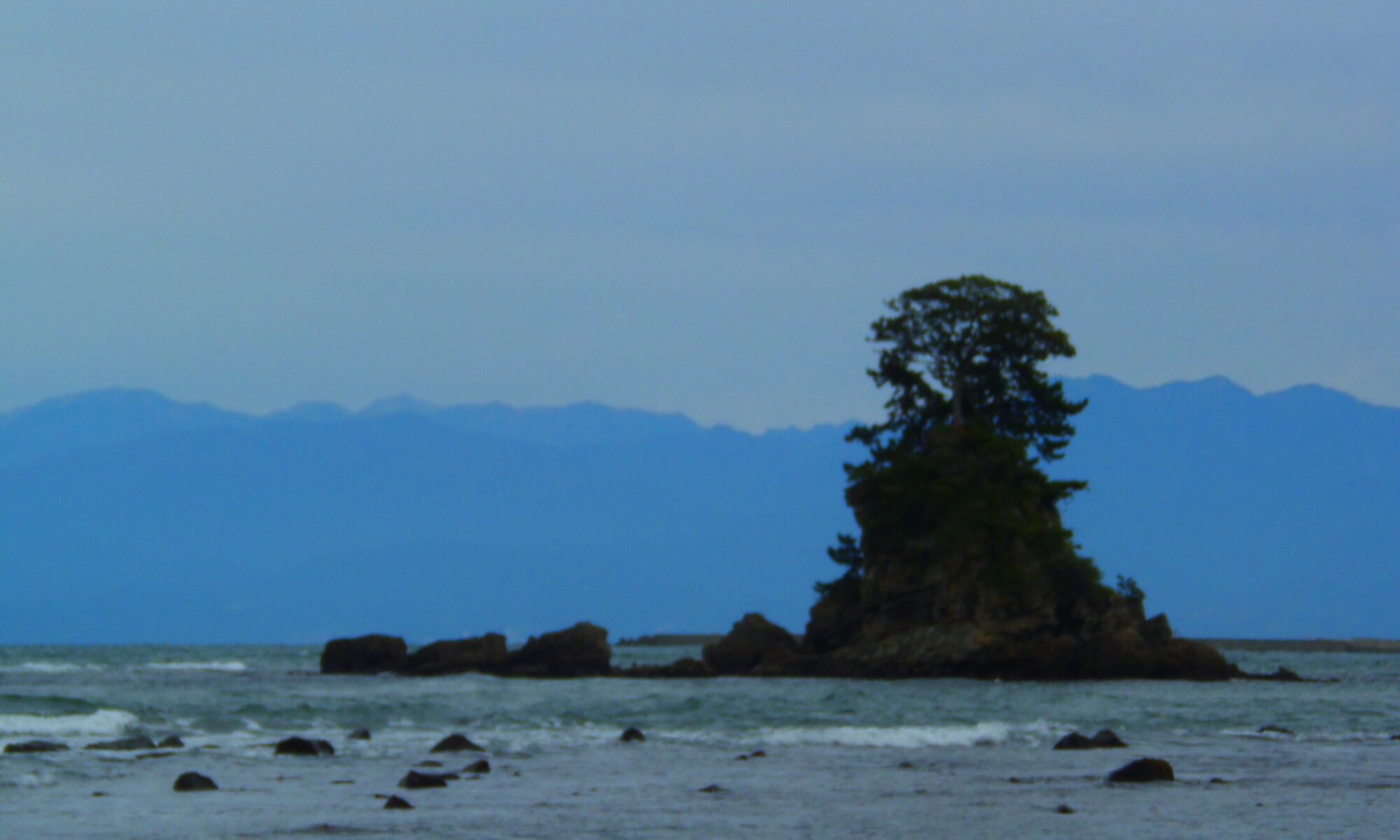 そして、JR氷見線に乗り、かねてから行きたかった「雨晴(あまはらし)海岸」へ。雪のない立山連峰でもシルエットが素晴らしい。海風にあおられながら、久しぶりの海岸散歩を楽しんだ。