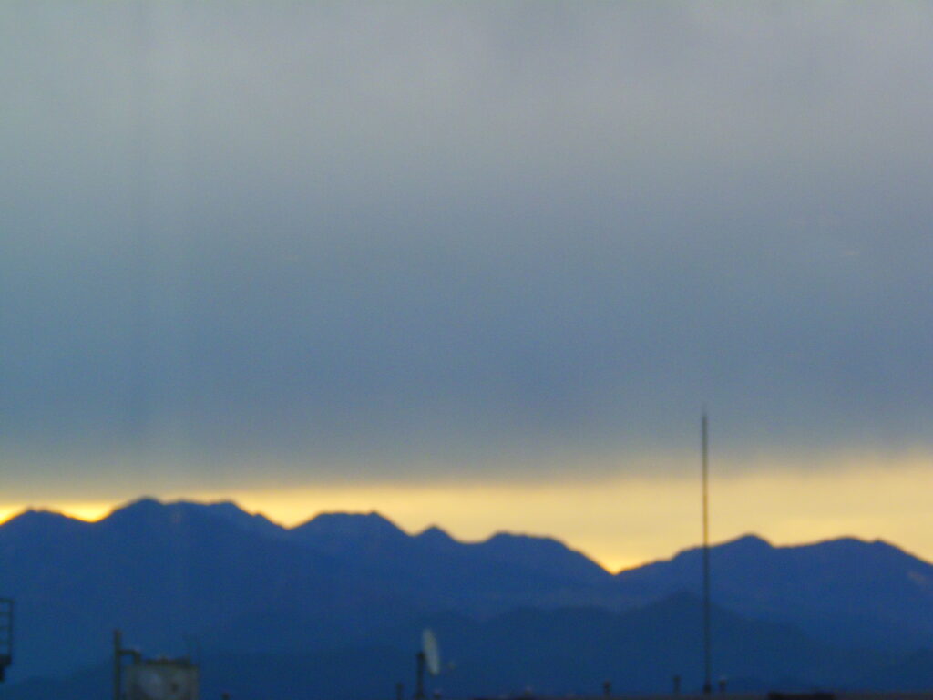 ◎ ホテル15階展望で朝食、遠くに能登半島も見える。朝6時30分の立山連峰に朝日が差す。(ぼけちゃった・笑)
