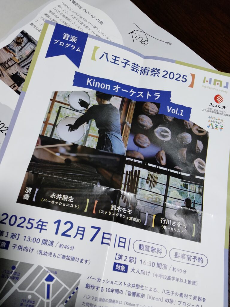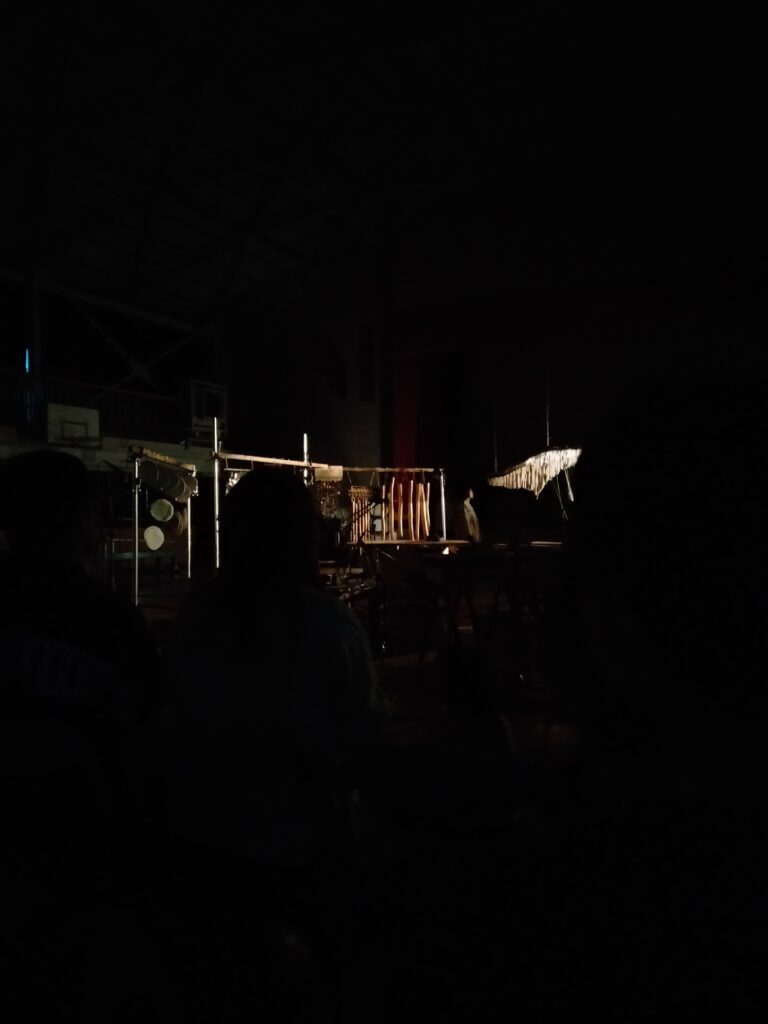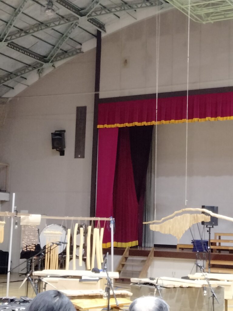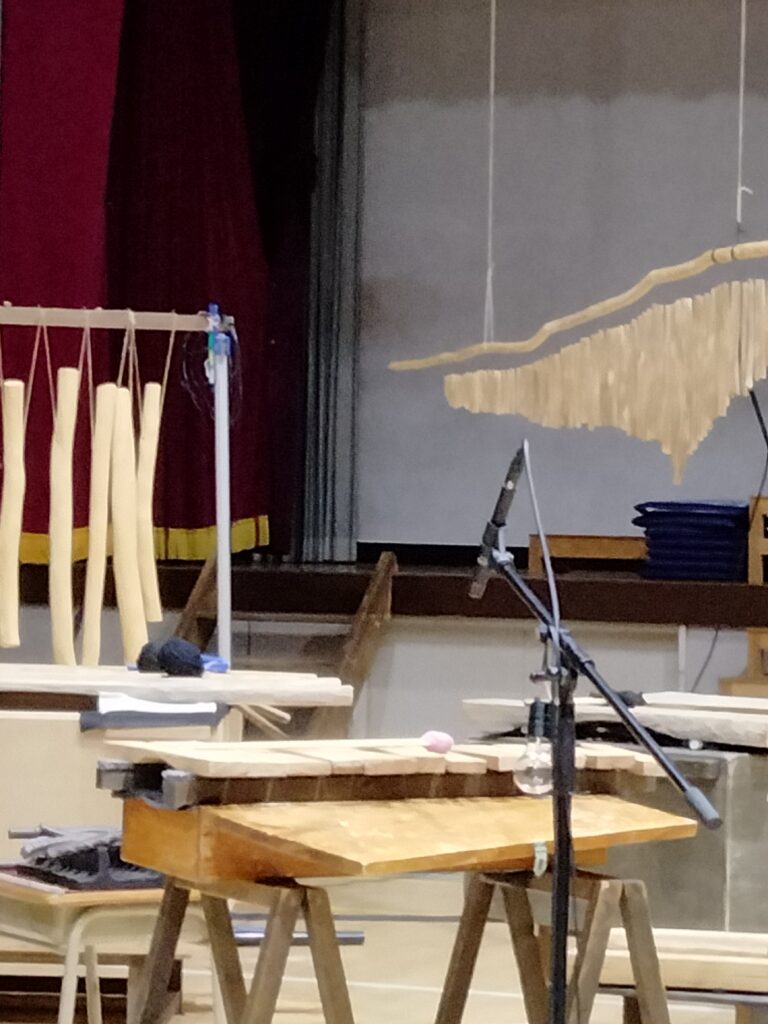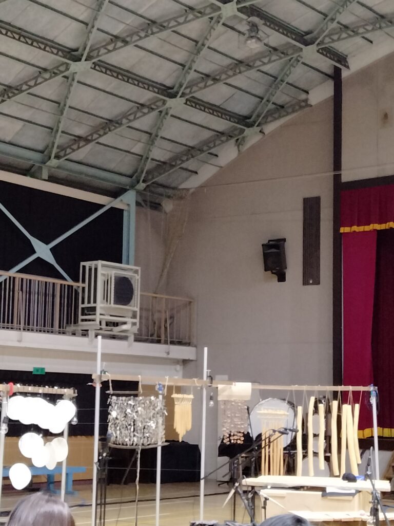 そのステージづくりが圧巻。体育館の真ん中に14種類の手作り楽器をオーケストレーションに則った配置(音響彫刻家の方の作品)で作られていて、お客様(約100人)はその半周を椅子や桟敷、ひな壇などに座るというステージング。