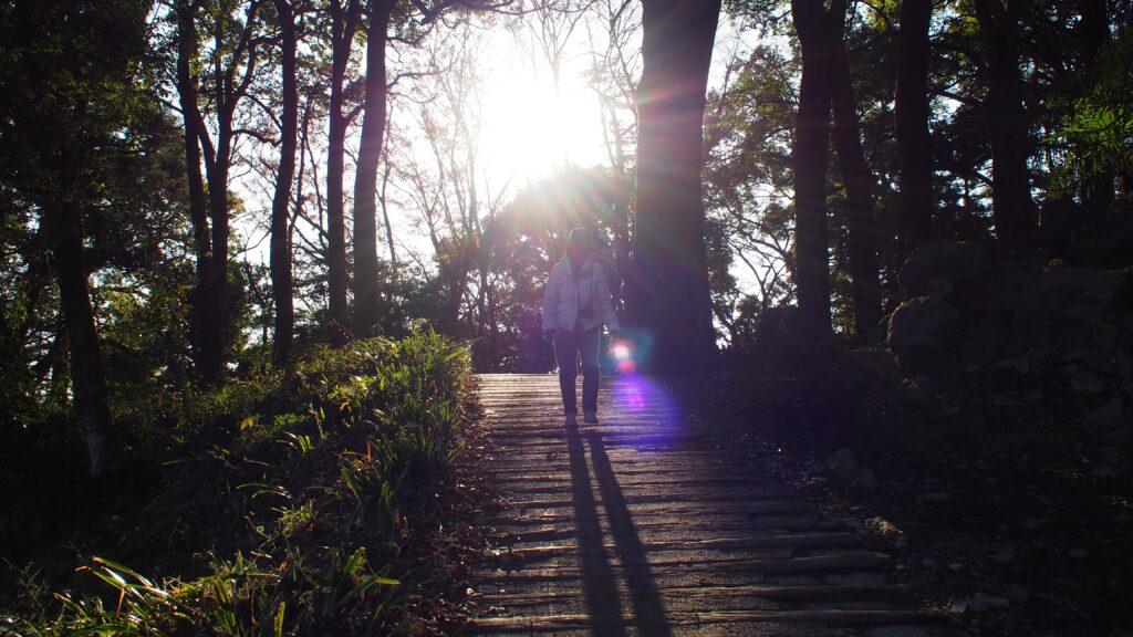 ◎ 下山中のわたし。(見た目より急な木道なので、慎重に降りている)